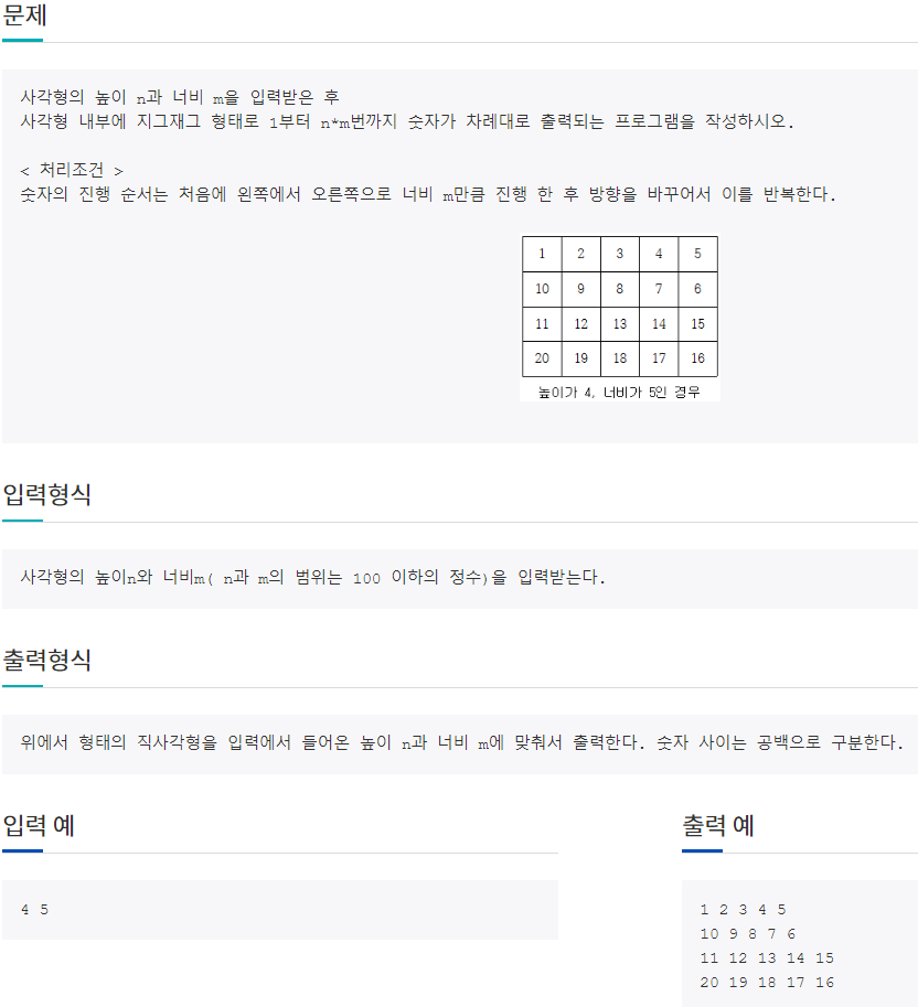 제한시간 1000 ms 메모리제한 256 MB 해결횟수 4592 회 시도횟수 9686 회 문제 사각형의 높이 n과 너비 m을 입력받은 후 사각형 내부에 지그재그 형태로 1부터 n*m번까지 숫자가 차례대로 출력되는 프로그램을 작성하시오. < 처리조건 > 숫자의 진행 순서는 처음에 왼쪽에서 오른쪽으로 너비 m만큼 진행 한 후 방향을 바꾸어서 이를 반복한다. 입력형식 사각형의 높이n와 너비m( n과 m의 범위는 100 이하의 정수)을 입력