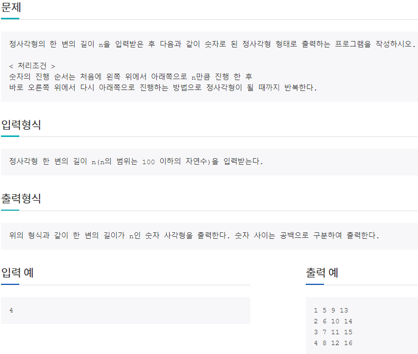 정사각형의 한 변의 길이 n을 입력받은 후 다음과 같이 숫자로 된 정사각형 형태로 출력하는 프로그램을 작성하시오. < 처리조건 > 숫자의 진행 순서는 처음에 왼쪽 위에서 아래쪽으로 n만큼 진행 한 후 바로 오른쪽 위에서 다시 아래쪽으로 진행하는 방법으로 정사각형이 될 때까지 반복한다. <생각하기> 열을 우선으로 하여 바깥 for문을 작성하고, 열이 결정되면 행을 나타내는 for문을 작성해서 채워나가면 된다. for (i = 0; i < n; i++)
