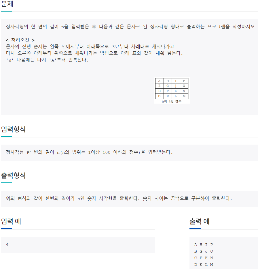 정사각형의 한 변의 길이 n을 입력받은 후 다음과 같은 문자로 된 정사각형 형태로 출력하는 프로그램을 작성하시오. < 처리조건 > 문자의 진행 순서는 맨 오른쪽 아래에서 위쪽으로 'A'부터 차례대로 채워나가는 방법으로 아래 표와 같이 왼쪽 위까지 채워 넣는다. 'Z' 다음에는 다시 'A'부터 반복된다. 정사각형 한 변의 길이 n(n의 범위는 1이상 100 이하의 정수)을 입력받는다. 위의 형식과 같이 한변의 길이가 n인 문자 사각형을 출력한다. 문자 사