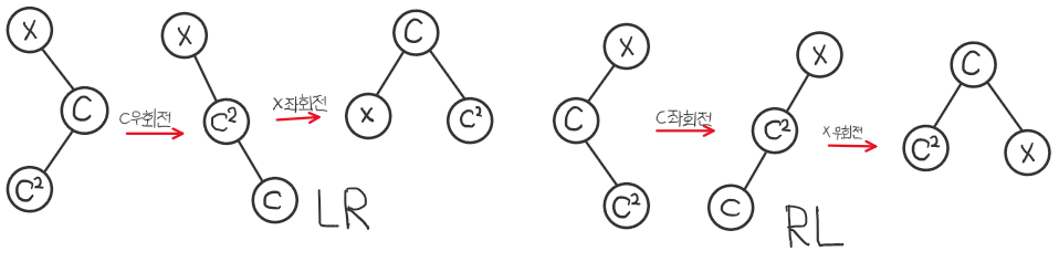 - c가 x의 왼쪽 자식이고, c²가 c의 오른쪽 자식인 경우(LR) c를 오른쪽 회전 후 x를 왼쪽 회전