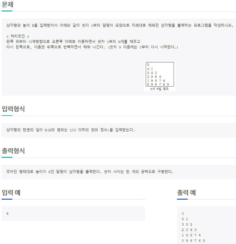 삼각형의 높이 N을 입력받아서 아래와 같이 숫자 0부터 달팽이 모양으로 차례대로 채워진 삼각형을 출력하는 프로그램을 작성하시오. < 처리조건 > 왼쪽 위부터 시계방향으로 오른쪽 아래로 이동하면서 숫자 0부터 N개를 채우고 다시 왼쪽으로, 다음은 위쪽으로 반복하면서 채워 나간다. (숫자 9 다음에는 0부터 다시 시작한다.) 삼각형의 한변의 길이 N(N의 범위는 100 이하의 양의 정수)을 입력받는다. 주어진 형태대로 높이가 N인 달팽이 삼각형을 출력한다.