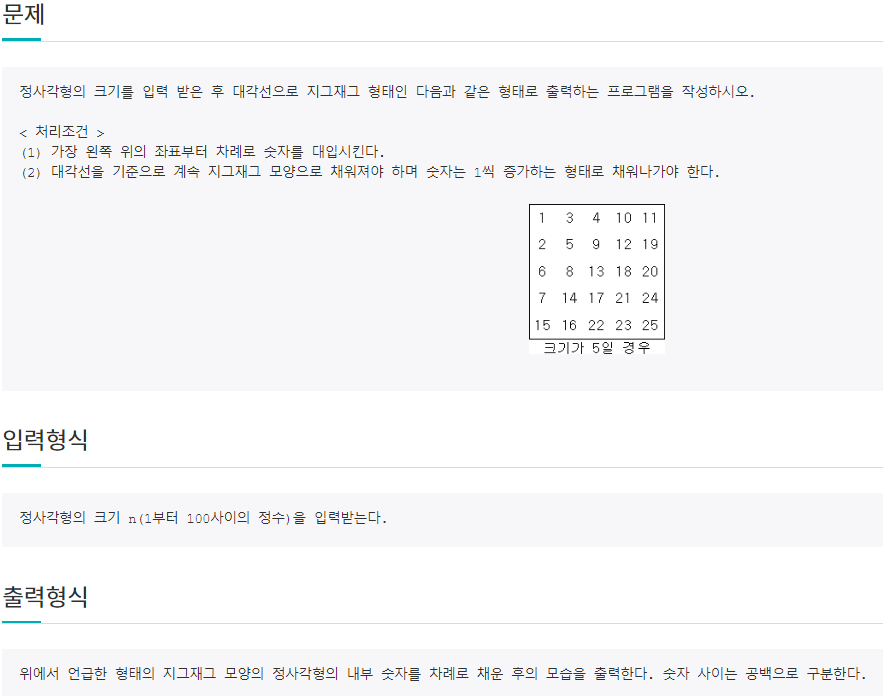정사각형의 크기를 입력 받은 후 대각선으로 지그재그 형태인 다음과 같은 형태로 출력하는 프로그램을 작성하시오. < 처리조건 > (1) 가장 왼쪽 위의 좌표부터 차례로 숫자를 대입시킨다. (2) 대각선을 기준으로 계속 지그재그 모양으로 채워져야 하며 숫자는 1씩 증가하는 형태로 채워나가야 한다. 정사각형의 크기 n(1부터 100사이의 정수)을 입력받는다. 위에서 언급한 형태의 지그재그 모양의 정사각형의 내부 숫자를 차례로 채운 후의 모습을 출력한다. 숫자