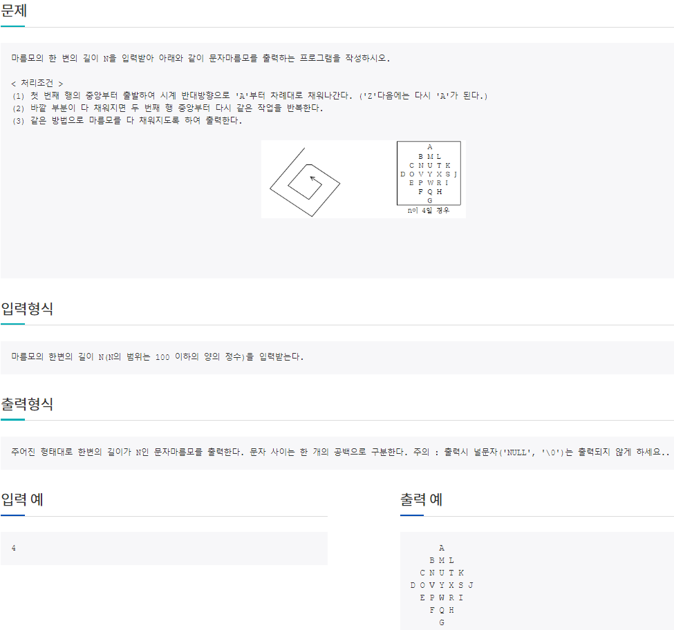 마름모의 한 변의 길이 N을 입력받아 아래와 같이 문자마름모를 출력하는 프로그램을 작성하시오. < 처리조건 > (1) 첫 번째 행의 중앙부터 출발하여 시계 반대방향으로 'A'부터 차례대로 채워나간다. ('Z'다음에는 다시 'A'가 된다.) (2) 바깥 부분이 다 채워지면 두 번째 행 중앙부터 다시 같은 작업을 반복한다. (3) 같은 방법으로 마름모를 다 채워지도록 하여 출력한다. 마름모의 한변의 길이 N(N의 범위는 100 이하의 양의 정수)을 입력받는다