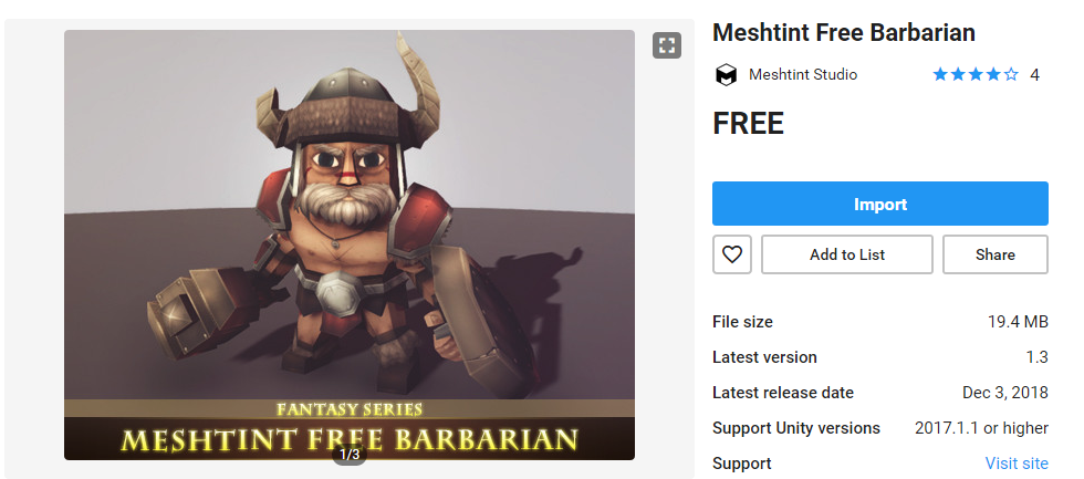 먼저, 3D 빈 프로젝트를 생성하고 에셋 스토어에서 Meshtint Free Babarian을 검색해 임포트해준다.