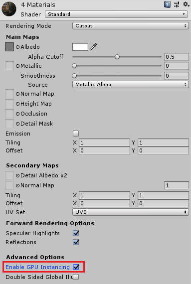 이후 인스펙터 창에서 Enable GPU Instancing을 체크해준다.