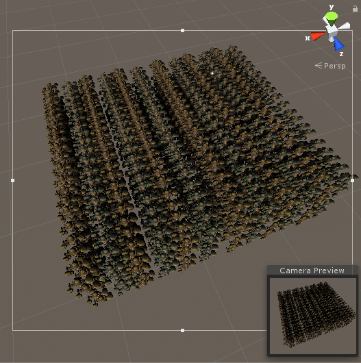 위에서 소개한 Prefab을 다음과 같이 배치하여 총 3,840개를 배치했다.