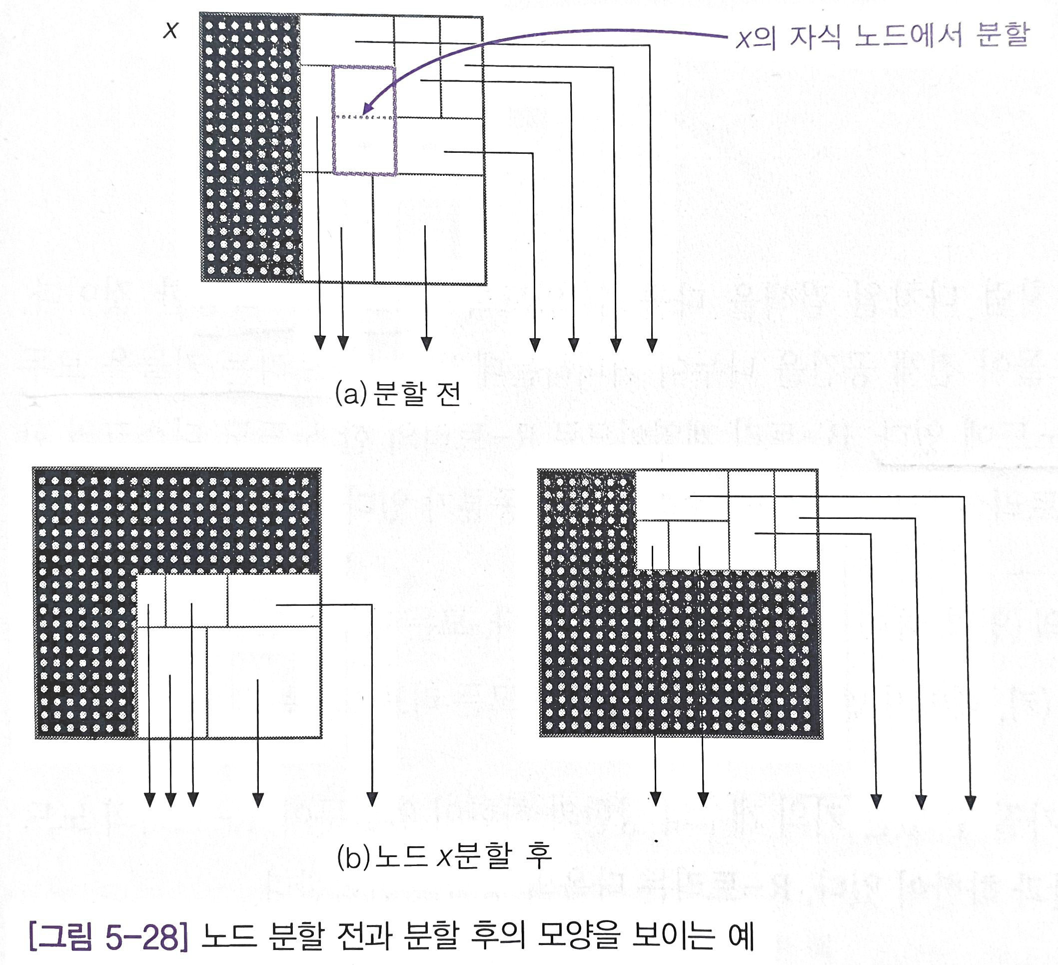 특정 노드가 분할되어 부모 노드에 할당됐을 때 공간을 수용할 수 없는 경우 분할된 기준을 부모 노드에 적용하여 두 노드로 분할한다.