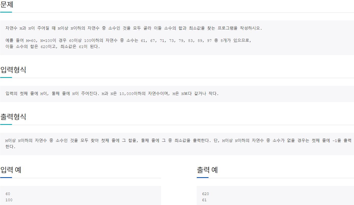 이 문제도 이전에 만든 소수를 확인하는 함수를 사용해 소수인 경우 sum에 값을 누적하고 최초로 소수로 판정된 경우 최소 값으로 저장해 출력하면 됩니다.
