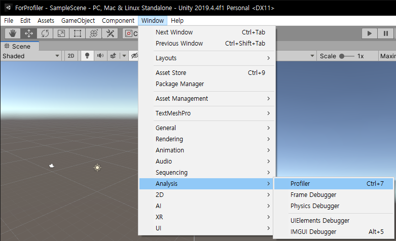 최신 버전의 유니티에서는 상단 메뉴의 [Window] - [Analysis] - [Profiler] 순으로 접근할 수 있으며 구 버전의 유니티에서는 [Window] - [Profiler] 순으로 접근할 수 있다.