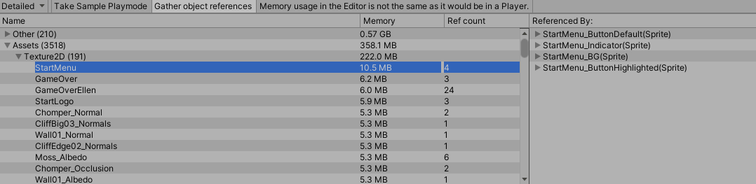 - Detailed 모드 메모리에 올라가 있는 에셋을 다섯 가지 분류로 나눠 계층적으로 표시한다. 개별 에셋의 용량과 참조 카운트, 어떤 개체에 의해 참조되고 있는지 등을 확인할 수 있다.